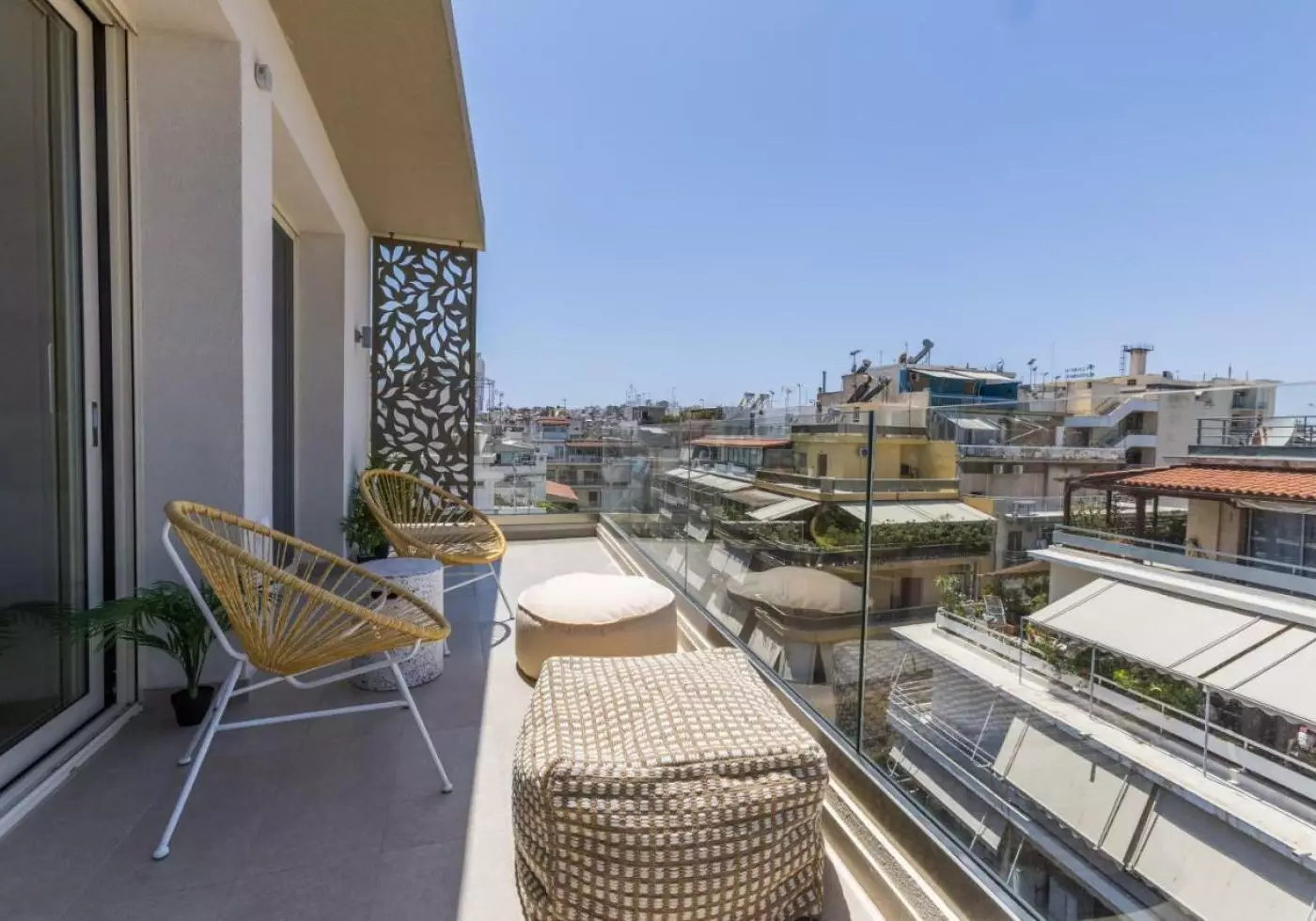 The highlight is the private rooftop terrace, featuring a pool, shaded lounge, dining area, and panoramic views across the Aegean Sea.
