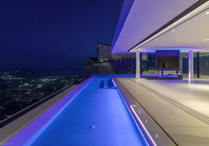 The home unfolds across three expansive levels, connected by a private elevator and surrounded by a 300 m2 landscaped garden with automated irrigation. A stunning 85 m2 infinity pool with jacuzzi, saltwater magnesium electrolysis system, and dual 0.5 micron filters sits on the first-floor terrace, while a decorative 5 m2 entry pool features a mature olive tree as its centerpiece. The residence is fully smart-enabled with a KNX system, Alexa voice command integration, solar power generation, underfloor heating, DAIKIN heat pumps, and full IP CCTV and alarm coverage. Wi-Fi access points, electric blinds, curtains, and shutters are installed throughout, with dedicated rooms for mechanical, electrical, and generator systems.