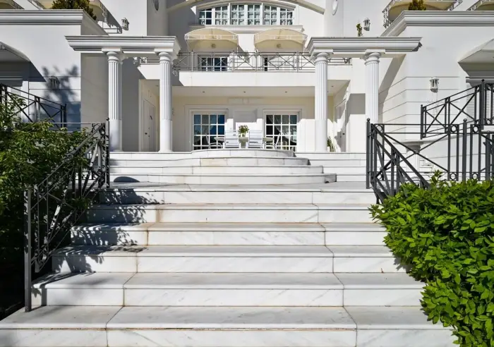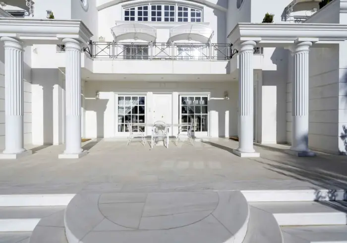 From the moment you arrive, the tone is set. A meticulously landscaped garden unfolds before you, centred around an impressive resort-style swimming pool, creating a private oasis of elegance. Grand marble staircases, crafted from luminous white Pentelic marble, lead to the private entrances of each residence — a timeless material choice that reflects classical Athenian grandeur and enduring sophistication.