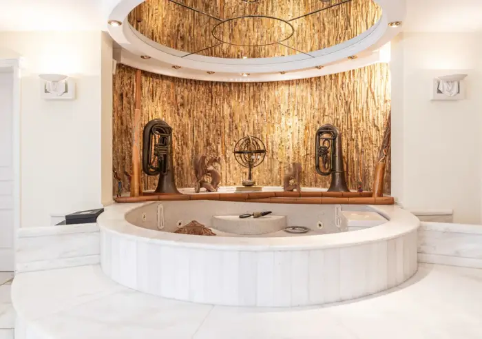 • Residences A & C feature a fully self-contained luxury apartment with a chic living room, fireplace, kitchen, two bedrooms, and three bathrooms. This level enjoys direct access to the garden and pool, ideal for guests, extended family, or staff accommodation.